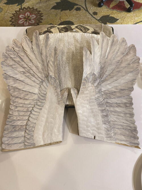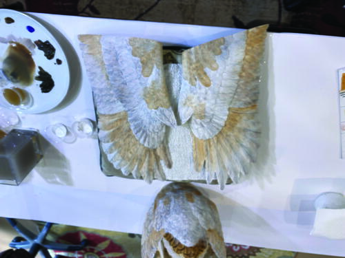 The underside of the open wings after three thin coats of gesso. I do like to have some coloring from the woodburning come through.