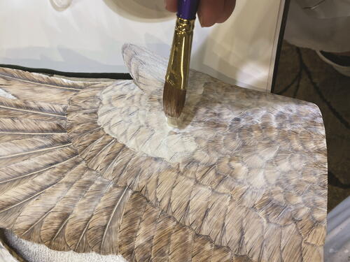 The first step is applying up to three coats of thinned gesso to the entire owl, striving for consistent, clean coverage. Then, with a deep gray color, I use an airbrush to subtly deepen the areas where the major feather groups meet. This enhances the visual illusion of depth. Next, using a mixture of 70% raw umber and 30% ultramarine blue, I airbrush in all the feather barring on the flight feathers. This process for me goes easily and doesn’t take much time. Using a little more raw umber mixed into the same mixture, I go back and darken the outer edges of the wings, as seen on the real bird.