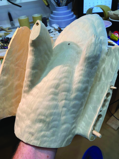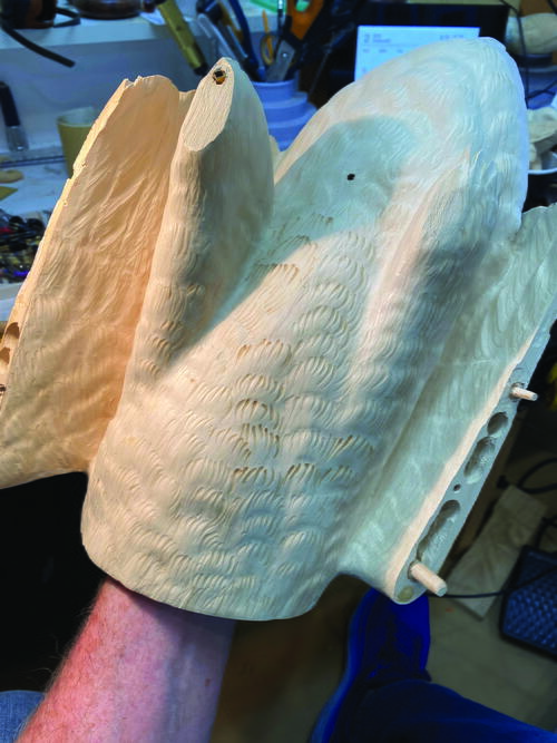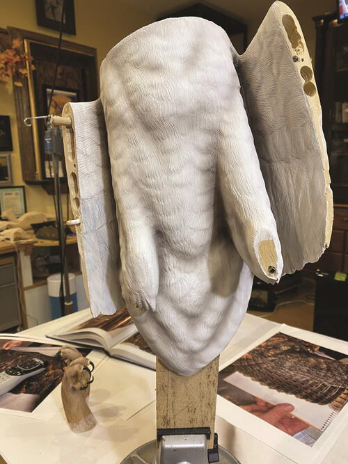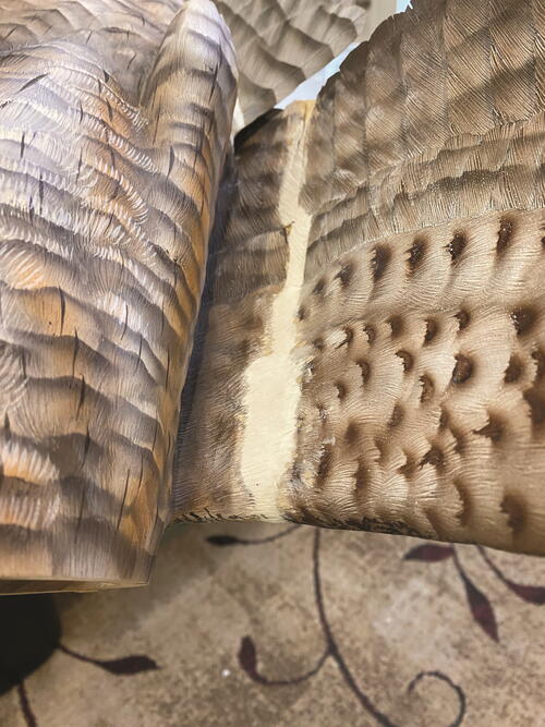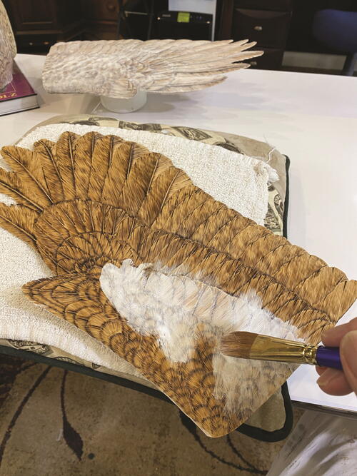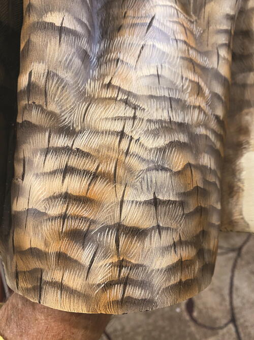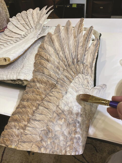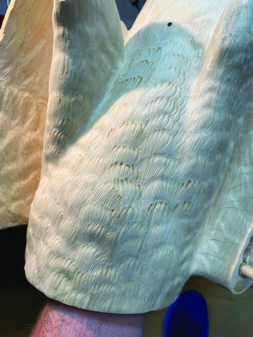 The nonburned areas of the carving will be softly sanded and lightly textured, as the feather structure in these areas is quite different from the top regions.