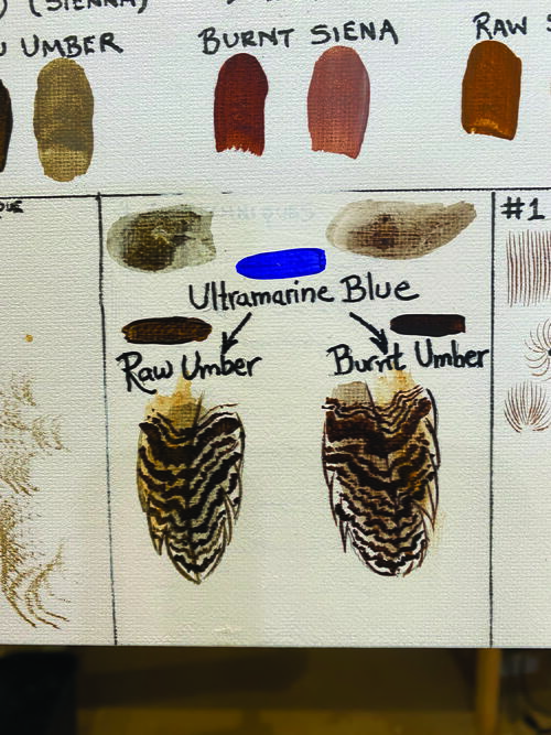Practice replicating the patterning on the test board first. That way, deciding things like paint consistency, mixture, and brush size and shape are resolved here and not on the bird.