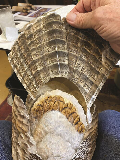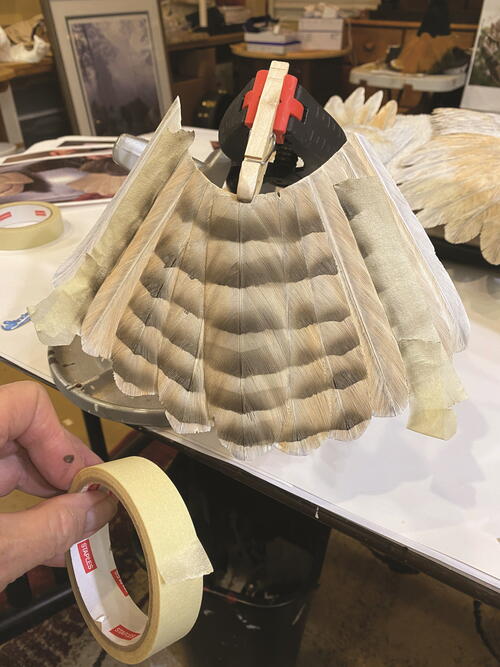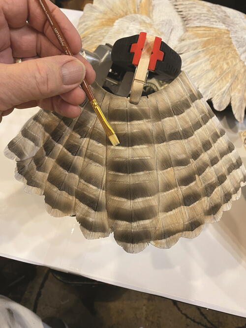 A clothespin helps hold the tail in position so I can airbrush the distinctive feather barring across the top surface.