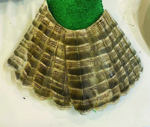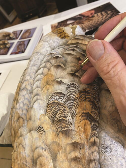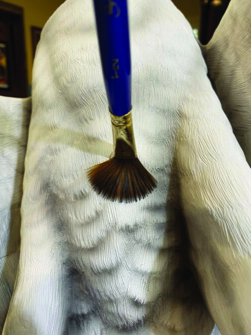 A careful study of the great horned owl’s cryptic, camouflaged plumage reveals a myriad of squiggle lines of varying width and density between most of the barring and up onto the body contouring feathers. Unfortunately, there is no easier way to achieve this plumage effect than settling into a comfortable chair and holding that brush as vertically as you can. For pure ease of access and the safety of these fragile pieces, I prefer to paint all the parts separately, starting with the tail.