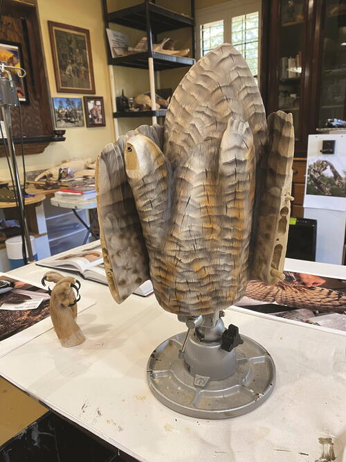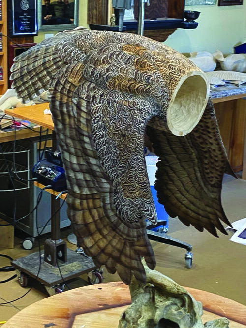 At this time, all the component parts are now in place. The support rod has been firmly glued into the rear of the left leg. What remains are many, many hours of second guessing myself and hyper-detailing every nuance of the big owl’s anatomy. I don’t finish my carvings—I abandon them!