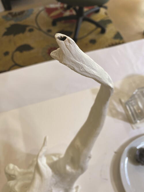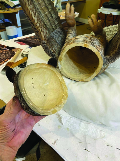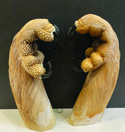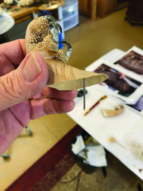 The owl’s legs and feet are carved separately and will be attached to the body once completed. The talons are made from A+B epoxy putty.