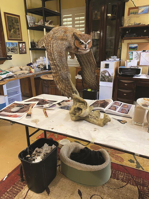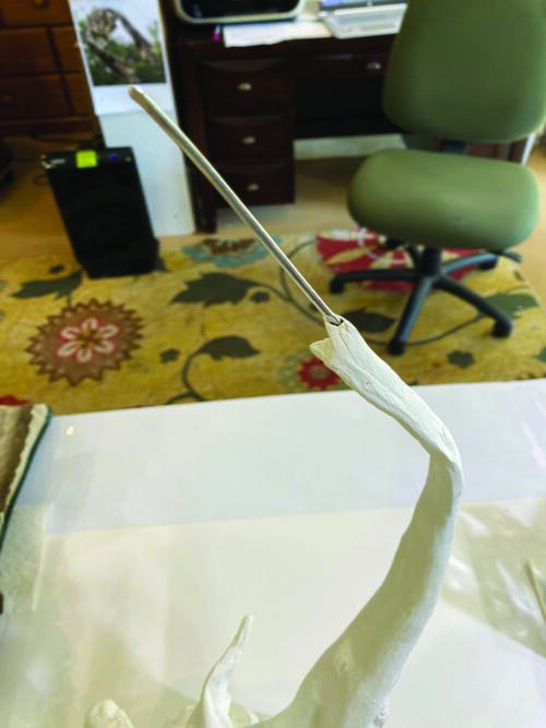 I use my airbrush to deepen the shadowing on the branch then apply many very thin watery washes of a neutral gray (60% burnt umber and 40% ultramarine blue mixed with an equal amount of white gesso to make a mid-tone gray). The 3/16” 308 stainless steel support rod is permanently attached to the owl’s body, epoxied into a hole drilled into the back left leg.
