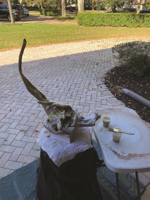 The joint area is coated with plastic wood and sanded smooth once dry. Then the feather pattern is drawn in.