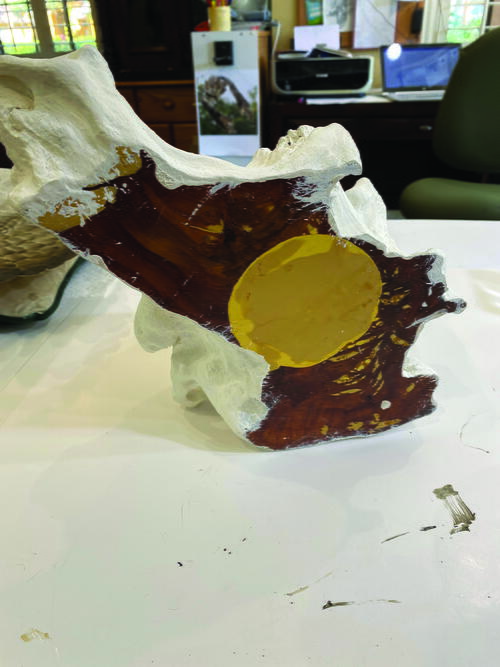 Once carved, I seal the composite branch with two coats of wood sealer. Up to five thick coats of white gesso are then applied and allowed to thoroughly dry. Often, I will coat areas of the branch with acrylic modeling paste and, using a natural sea sponge, stipple on a pebbly surface as it is drying. When creating habitat such as this, you are only limited by your own creativity.