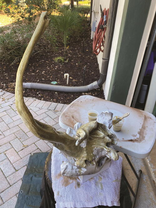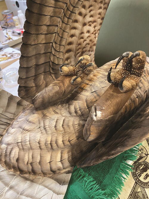 The feet were painted with a mixture of raw umber, raw sienna, and white. The talons were painted using a 50/50 mixture of ultramarine blue and burnt umber. Once dry, I coat them with satin polyurethane. The toe pads are darkened slightly with raw umber, and the small spots are a mixture of acrylic modeling paste and raw umber dipped on with a #1 pointed sable brush.
