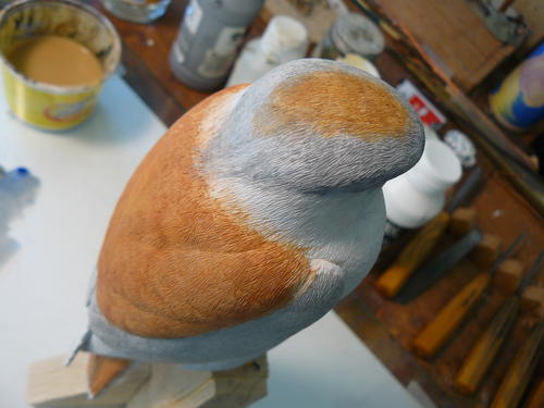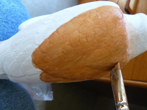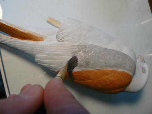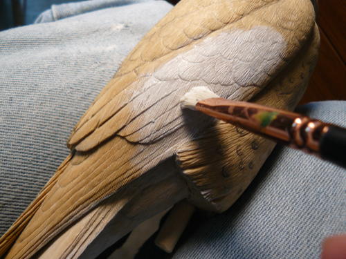 Before I begin painting, I apply a 50/50 lacquer/water seal to the finished bird. This allows me to retain the textured detail by applying gesso washes instead of straight gesso when I build up a uniform white gesso surface.