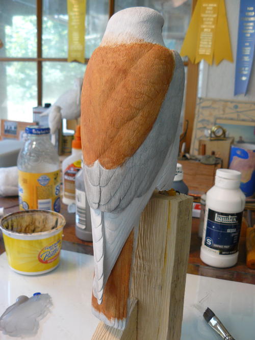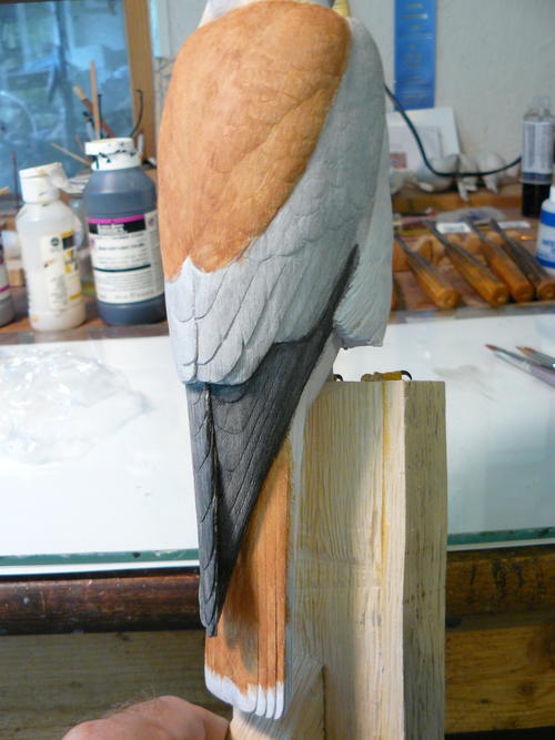 This back shot shows what has been covered so far. I can work in the banding on the back spotting feather later.