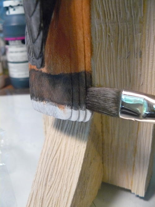 In this photo, I use a mix of black gesso with some burnt umber to paint the outer edges of the primaries. This gives definition to the individual primary feathers. Leave the lightest value of color in the front end of each feather.