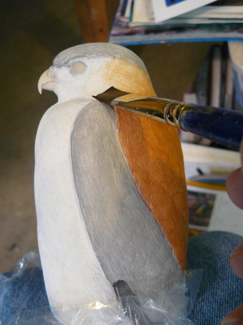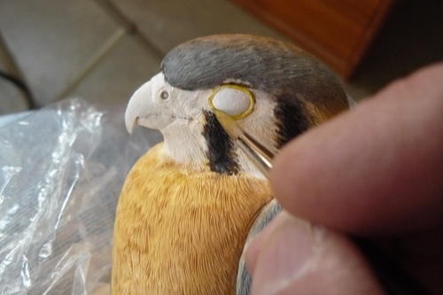 Time to finish painting the face and bill. I use a mix of cadmium yellow and a small amount of burnt sienna to paint some areas of the face, including the eye ring.