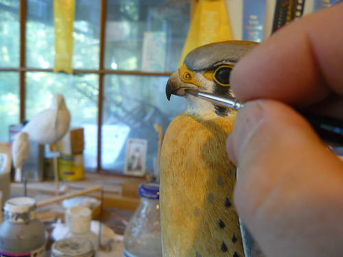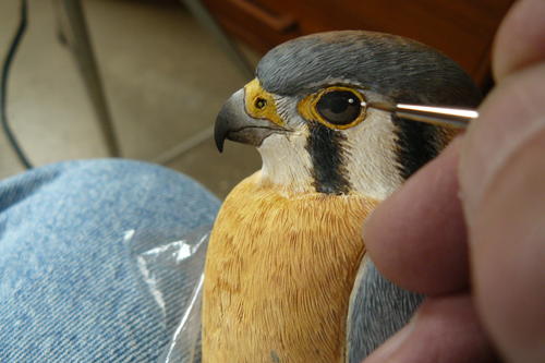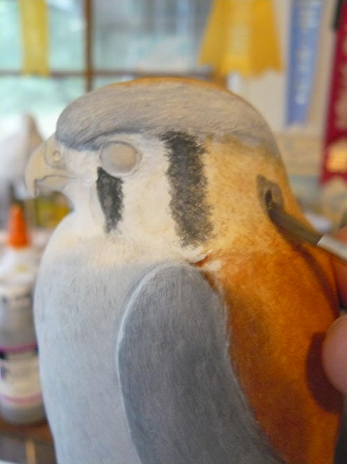 The eyes of the kestrel are quite dark. I carve in my eyes and paint them. Here I’ve started with a mix of black gesso and burnt umber, which creates a warmer black than straight black gesso would.