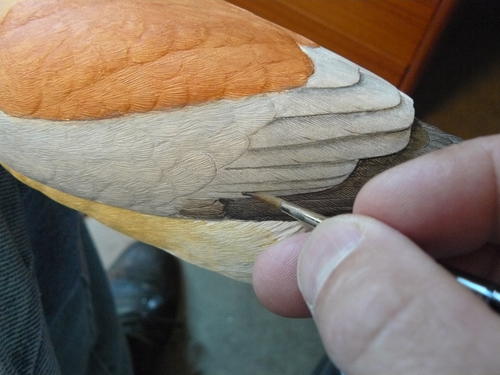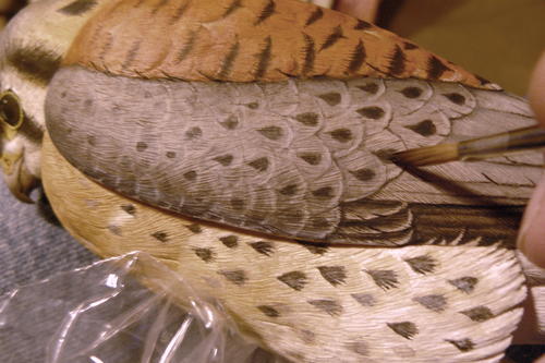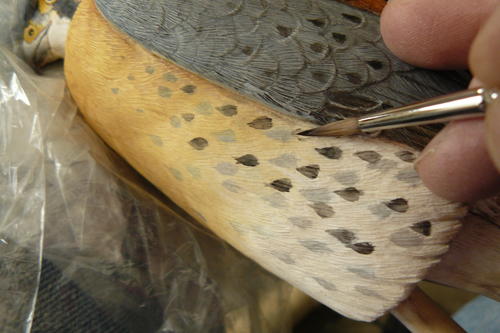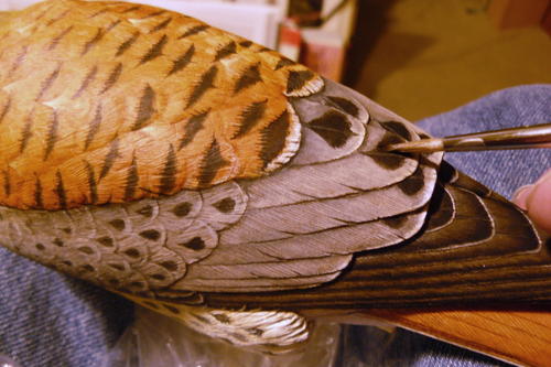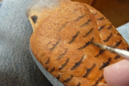 Now it’s time for the bars on the back. As you can see here, the bars tend to widen as you move down the back. I am also adding the large dark spot markings to the secondary feathers, and I’ve painted smaller spots in the center of the secondary covert feathers using the same mix used for the back barring.