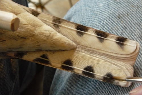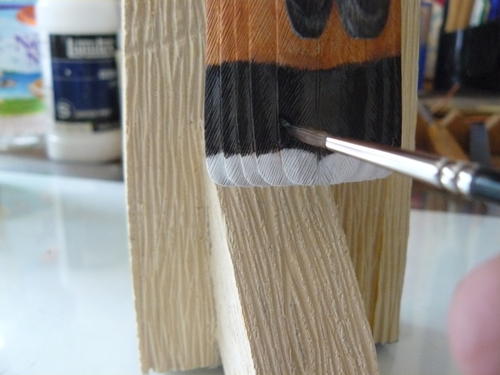 The outer tail feather spots are in place. The feather quills on the undersides of the feathers tend to be a lighter value than those above. I paint these quills with white gesso mixed with a little yellow oxide.