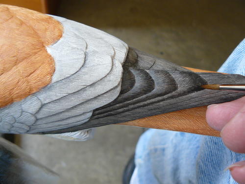 On the underside of the tail, I begin to add markings to the edges of the outer feathers, starting light in the beginning. Once I’m satisfied with their location, I can darken them with same mix I used for barring and spots.