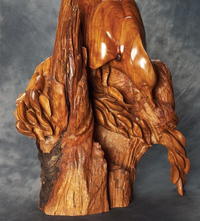 After I removed the sap wood, the work fell into three basic phases. Roughing out took approximately four hours. At that point, the design was essentially complete. That design process—determining the subjects' perceived movements and the dynamic positioning of volumes within the carving—was the project's most critical aspect. At this point, the precise dimensions are not a major factor. The flow and the final measurements will be at the mercy of how the wood reacts to the drying process.