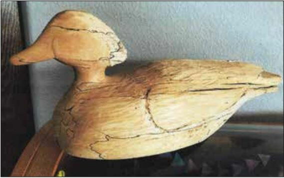 I am a member of the Capitol Area Carvers in Madison, Wisconsin, and the Wisconsin River Woodcarvers. When I participated in the Wisconsin River show in Sevens Point last September a gentleman approached my display area with a story and a request. He had a block of wood with a duck head roughly carved on it. He explained that, as a youth, his family had a wooden chopping block in their home. Later in life, he saved the block as a cherished memory of his family and childhood. He had envisioned carving a decoy from it for his current home. He had worked on the block but realized he had gone as far with the carving as he could. His question to me was, would I help him achieve his dream of a primitive decoy that he could display, made from the chopping block?