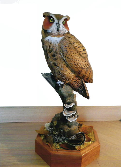 I am a retired police officer who started bird carving some 20 years ago after retiring. I started getting Wildfowl Carving Magazine and Competition around the same time and have every issue to date. I purchased Keith Mueller’s Half-size Great Horned Owl through the British Decoy and Wildfowl Carvers Association and after reading it cover to cover decided to give it a go. I decided to go whole hog and do a life-size bird. Our problem on this side of the water is that it’s almost impossible to get tupelo, so I used three pieces of jelutong, two of which I glued up for the body and I used the third piece for the wings. I did use Keith’s method with the wings. He was spot on when he said this was probably the most difficult part of the exercise. Doing my wings considerably larger, I followed Keith’s instructions regarding cutting, shaping, and fitting. I tried to follow his painting instructions but found it very difficult as I paint only with acrylics and have no access to an airbrush (something I think I will have to rectify). I cut the feet and talons from olive wood, which carves well. The branch is jelutong and the leaves around the base are brown paper, painted in autumn colors to complement the bird. Congratulations to Keith on the book—it’s a brilliant piece of work.