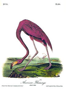 John James Audubon depicted the flamingo in his Birds of America. “Their walk is stately and slow, and their cautiousness extreme, so that it is very difficult to approach them, as their great height enables them to see and watch the movements of their various enemies at a distance,” he noted.