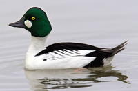 North America has two resident goldeneye species that cross the continent in their annual journeys. The common goldeneye travels from the northern boreal forests to the Atlantic coast and back each year. Its scientific name, Bucephala clangula, literally means “big head, whistle wings,” a reference to its rounded head and the way its wings whistle in flight. The Barrow’s goldeneye (Bucephala islandica, which translates as “big head Icelandic” because it was first discovered in Iceland) prefers the montane forests of northwestern North America, and it winters in the Pacific coastal areas. Barrow’s goldeneyes and common goldeneyes are similar in appearance, but can be distinguished by head shape. The common goldeneye has a sloped head and bill silhouette, whereas the Barrow’s goldeneye head protrudes forward, giving the bird a look reminiscent of a cartoon alien.