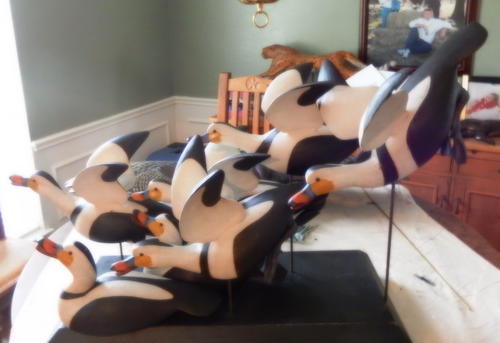 A few years ago Frank and I talked at the Easton Waterfowl Festival in Maryland. He asked me to make him a pair of “dead hang” Labradors. Some months later, Frank asked me to add some passenger pigeons to the piece. When I delivered the finished work at the festival the next year, Frank asked me to make a pair of contemporary antique gunning Labradors. I worked up a pair of birds but felt unhappy with them. I told Frank I was cutting out a second pair. He asked me to finish the first pair as well. I wasn’t happy with the second pair either. I really wanted to make something different for such a diverse and large collection. I decided to put the original four gunning decoys on hold and began to design what I considered to be an “Audubonesque” piece. I have long loved the way John James Audubon positioned the waterfowl in his paintings. They look as if they are in impossible, awkward poses or are flying too sharply downward. His birds crowd each other in mid-flight, and sometimes look like they are about to collide.