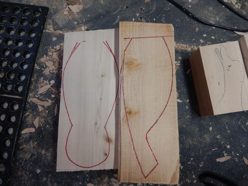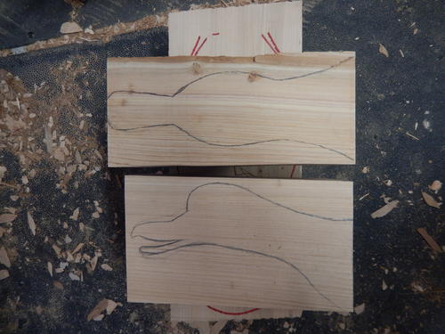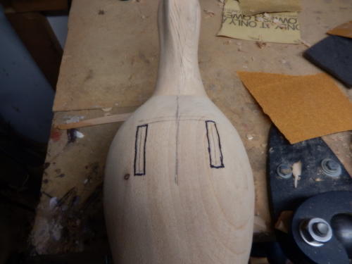 I laid out the wing insertion positions on the body blocks as shown here, and then cut the channels to accept the wings to a depth of about three quarters of an inch. That made a good, solid connection.