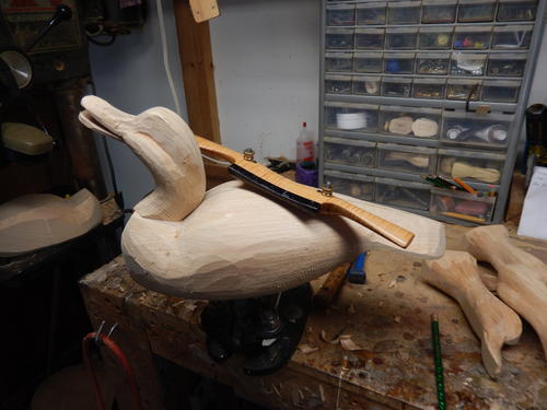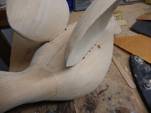 I set each wing in place with epoxy and then filled the remaining gaps with epoxy wood filler to create a smooth transition from the body blocks into the flow of the wings. (I’ve already attached the head on this duck—see the next step for details.)