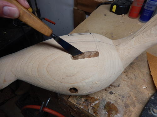 To insert the wings into the bodies, I drilled out most of the wood from the channels, and then finished up by squaring them with chisels. The cavities were just big enough to receive a stub I left on each wing for insertion into the body blocks.