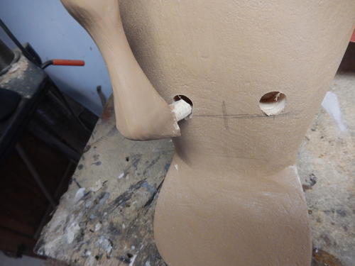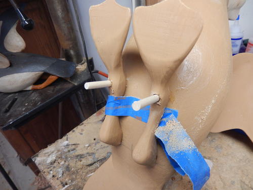 I drilled each of the heads for dowels and attached them to their bodies with three eighths dowels and epoxy. Where possible, I also set dowels through the base of the necks and into the bodies (second photo).
