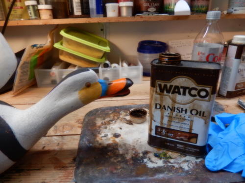 For the heads, I did the base colors in Milk Paint and then switched to Old Holland and Mussina oils for some blending and depth of color. I decided again to go with the “less is more” approach on the cheeks, opting for blocks of stylized color in circular patterns consistent with the gunner paint scheme on the rest of the bodies. When I got to the bills I did do a bit of blending in oils. When the birds were complete, I gave them a couple of rubdowns with Watco oils to give them a bit of mellow patina.