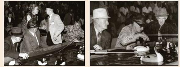 Left: Steve Ward greets Amanada Blake (Gunsmoke’s Miss Kitty) in 1975. Right: Lem Ward (center) judges decoys at the 1976 competition with Paul Marshall and Corb Reed.