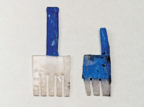 I used combing techniques for both the vermiculation and breast markings. I knew I had to incorporate variety in the vermiculation and ended up using a medium-spaced comb for the finest patterns and a custom-made comb for the coarse vermiculation. This comb was used over a large portion of the back as well as in the transition between the breast markings and the vermiculated region of the side feathers. The unique patterns of the breast feathers required a specific comb designed to match the feathers of the real bird.