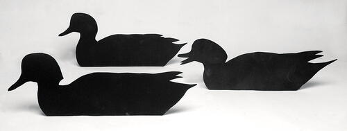 To model the three birds in the rig, I tried something I had never done before. Initially, for each bird, I made different versions of side profiles in two dimensions, tracing them onto thin cardboard, cutting them out, and painting them black. Putting the silhouettes together helped me visualize the composition. I did not need to see colors or detail; in fact, by eliminating these distractions, the best composition was perhaps easier to develop.