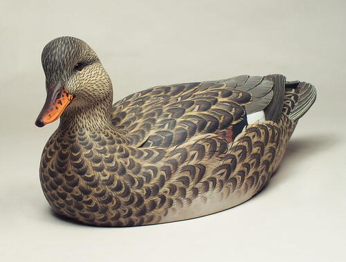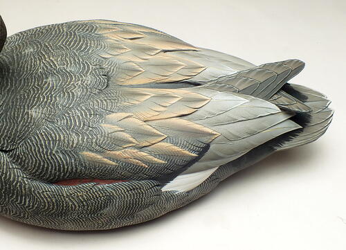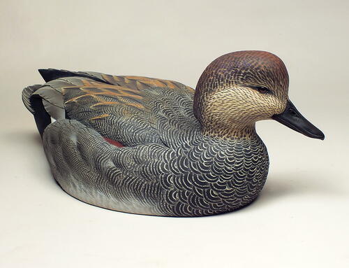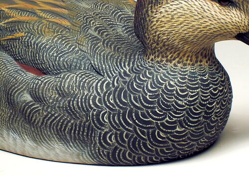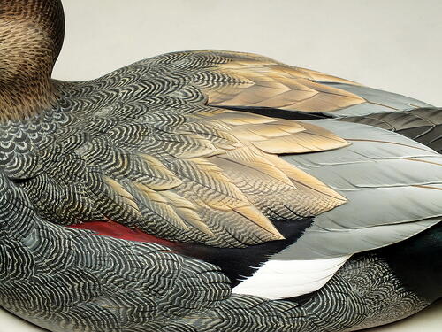 The gadwall drake, also known in Louisiana as the gray duck, for obvious reasons, is a bird of low contrast and a lack of brilliant color. What is so appealing to me are the patterns created by the fairly coarse vermiculation and the crescent-shaped breast markings. From a distance, all this detail projects as a dark gray. For a true gunning decoy, these regions could just be painted gray with no detailed pattern. For the World show, however, I definitely had to create the painted patterns.