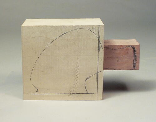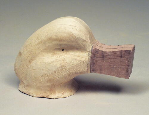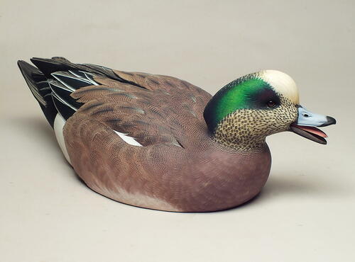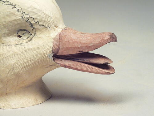 To ensure strength in the open bill of the wigeon drake a piece of cornel dogwood was inserted into the block of tupelo before cutting out the profile of the head. At that point the head was shaped in traditional fashion.