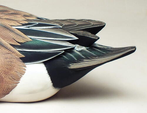 Even though the category requires that the decoys be durable, and so the tails must be thick, I wanted to create an optical illusion to make the tail look thin. The tails of most birds are usually light in value, so when I paint the tail feathers, because the tail must have additional thickness, I paint the excess wood below the light edge of the feathers dark. When viewed from a distance, the light-colored tail is very visible whereas the dark excess wood basically disappears. All three of these birds in this rig are great examples of this illusion.