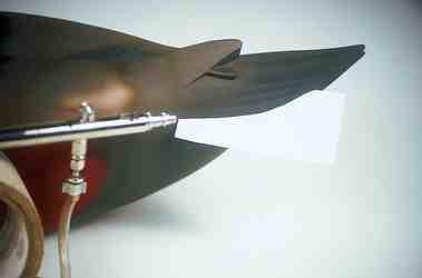 Using the IWATA HP-C airbrush, I spray the dark color mixture (c) on the tail, rump, and shadows on the back and head. I next mask off the side pocket and spray with the orange mixture (b).