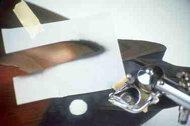 To create a dark edge on the tail feathers, cut out a stencil of a tail feather. Using carbon black, spay with a smaller airbrush. I use a Badger 100SG, a tool that has become one of my favorites since I first tried one that was given to me by Georgetown Arts. Airbrush the black edges.