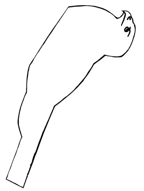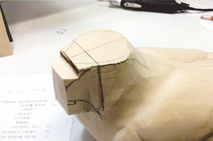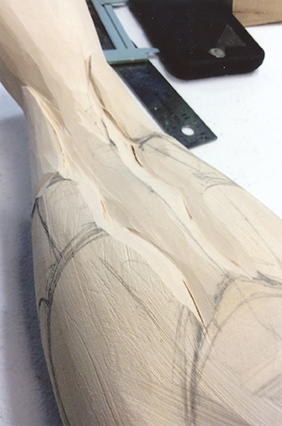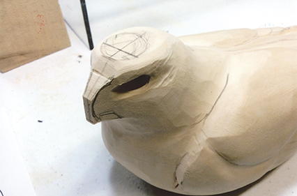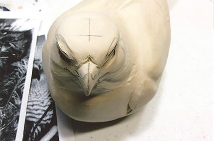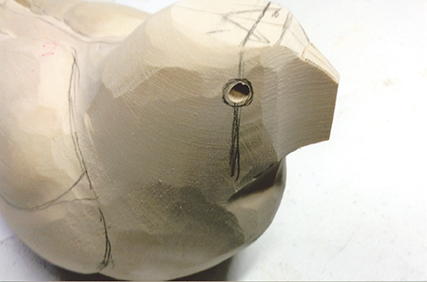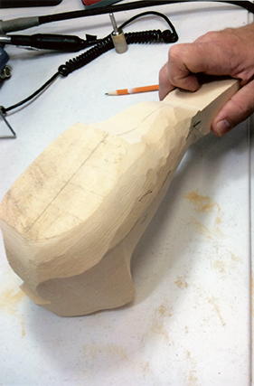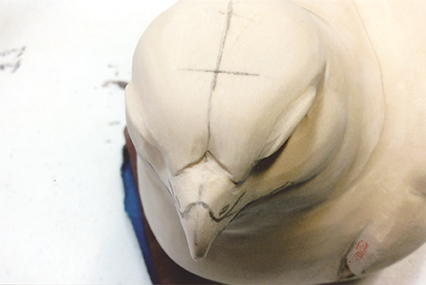 Determine how you want to place the head. There is still time to make slight changes. Lower and pull back the head by cutting 1⁄4 of an inch from the top and front. Keep the cutter straight. Locate the center of the eye by measuring 20 mm from the front edge of the bill (not from the point) and draw a 90-degree line across the top and straight down the sides. Draw the side outline from the pattern. Don’t hold the pattern down, as this will distort it. Instead, keep the pattern straight along the side and “project” it. Keeping the cutter flat, cut the profile, starting with the bill/head point. Round the forehead and bill. Cut under the bill, leaving a little extra wood.