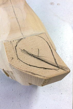 Redraw the side profile. Continue shaping the head and rounding with the fine drum sander. There is a flat spot on top of the head about the size of a penny. Draw a circle on top (or trace a penny) and round to that.