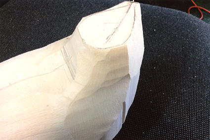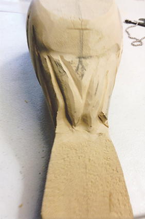 Using the diamond cylinder, cut the V-notch and lower it to the bill plain (reshaping the notch if necessary). Remove wood from under the bill. With the base at 10 mm, taper the bill and round over the top.