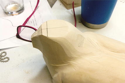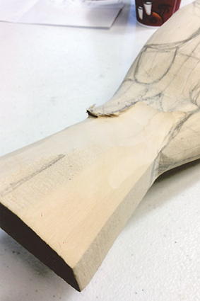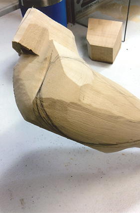 Use the contour of the drum sander to create a valley between the head and the wrist. Resolve the angles you create doing this. Now go over everything you’ve worked on to this point and smooth things out. Begin rounding the top of the tail a bit.