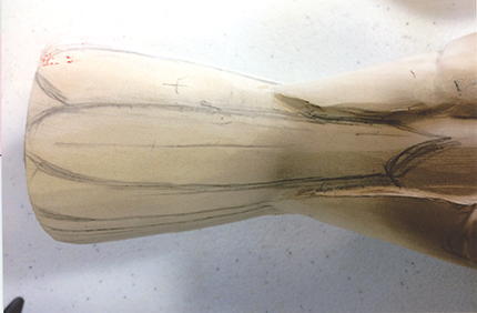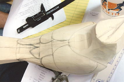 Roughly sketch in the wing groups. Primaries-secondaries are approximately 26 mm, measured from the band saw cut mark. Remove the ends of the primaries to get the proper length. Mark the other wing groups. The wing chord can range from 152 to 180 mm. I used 156 mm for this project. End of the primary to the alula is 106 mm. End of primary to the cape is 102 mm, and the cape width is 42 mm. The end of the primaries to the scapulars is 66 mm. The end of the primaries to the primary coverts is 90 mm.
