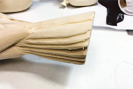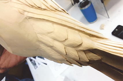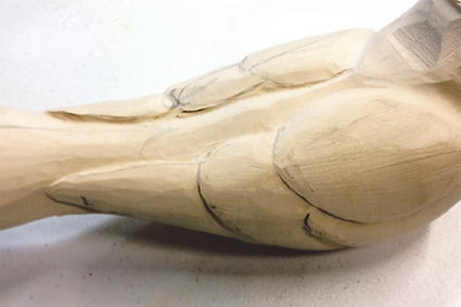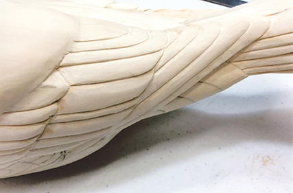 Still using the fine drum sander, begin to shape the underside of the primaries and inside edges of the feather groups. To create an east–west curve on the inside edges, don’t be afraid to go fairly deep into the back feathers.