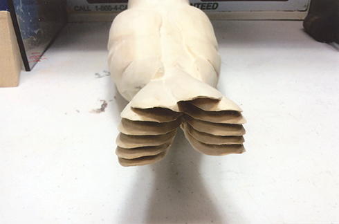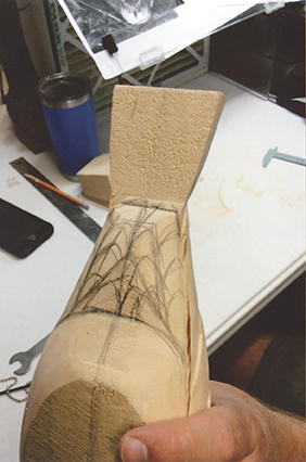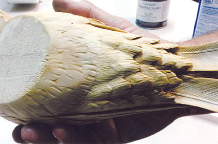 Draw an arc on the back of the tail, approximately a quarter-inch down from the top. With a fine drum sander, shape the tail, keeping it level all the way up to the coverts. Be careful you don’t hit the primaries, which will be slightly raised above the tail.