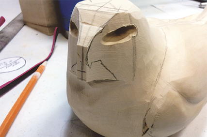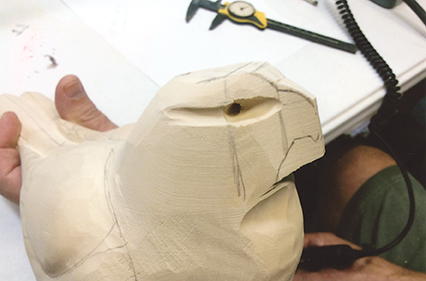 Start shaping the head to size with the fine drum sander. This is the time to begin giving the face its proper symmetry.