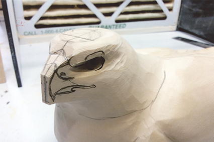 Draw the top profile, projecting from the pattern. Keeping parallel to the centerline, cut to the lines. Use the curve of the sander to create the curve from the bill to the head. Keep the angle at 90 degrees at the bill and transition to a slight bevel on the forehead and cheeks so that the bottom of the head is a little wider.
