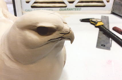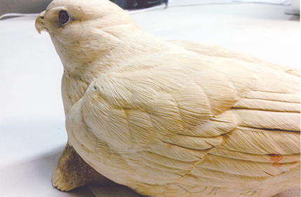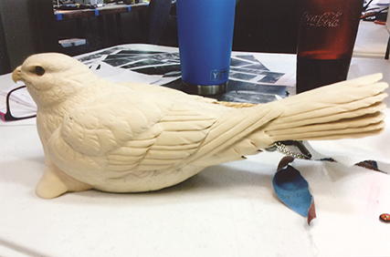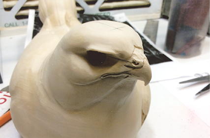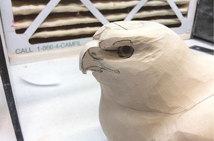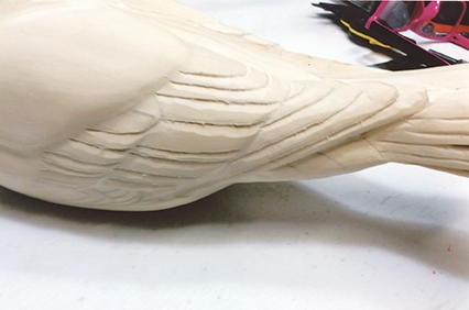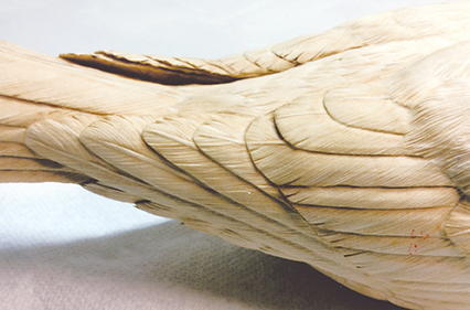 Cut in the feather groups with the diamond rounded cylinder and then smooth out the edges you’ve created. Pick some larger feathers to “lump and bump.” Make splits with a burnishing ball on the ends of all the feathers up to the back/top of the head. Sand with 400-grit to smooth out the edges.