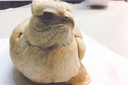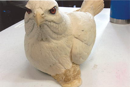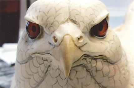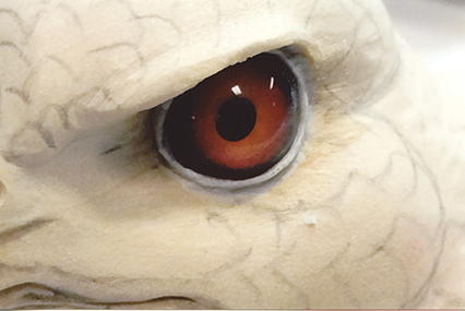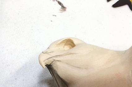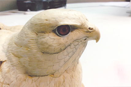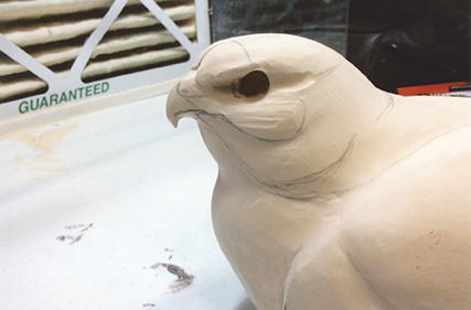 The nostril is not a round hole; it’s shaped like a kidney bean. Carve a large hole, then a smaller hole, and connect them. Use the diamond ball to “pinch” above the holes to get some lift, then sand the entire bill/cere. Drop some super glue onto the bill when you’re done.